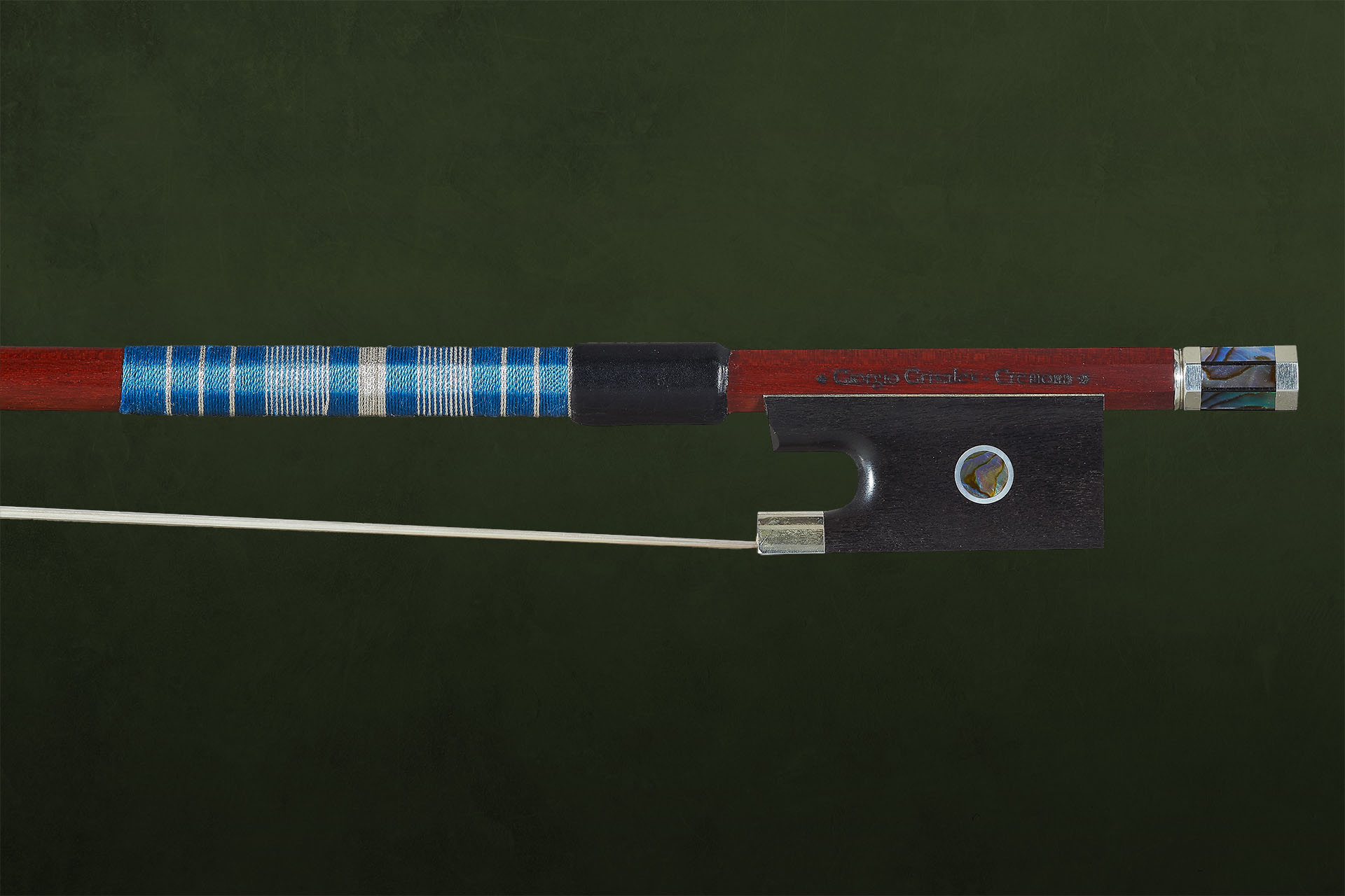 In Filo di seta rivestito di argento alternato a filo di seta di colore blu chiaro.